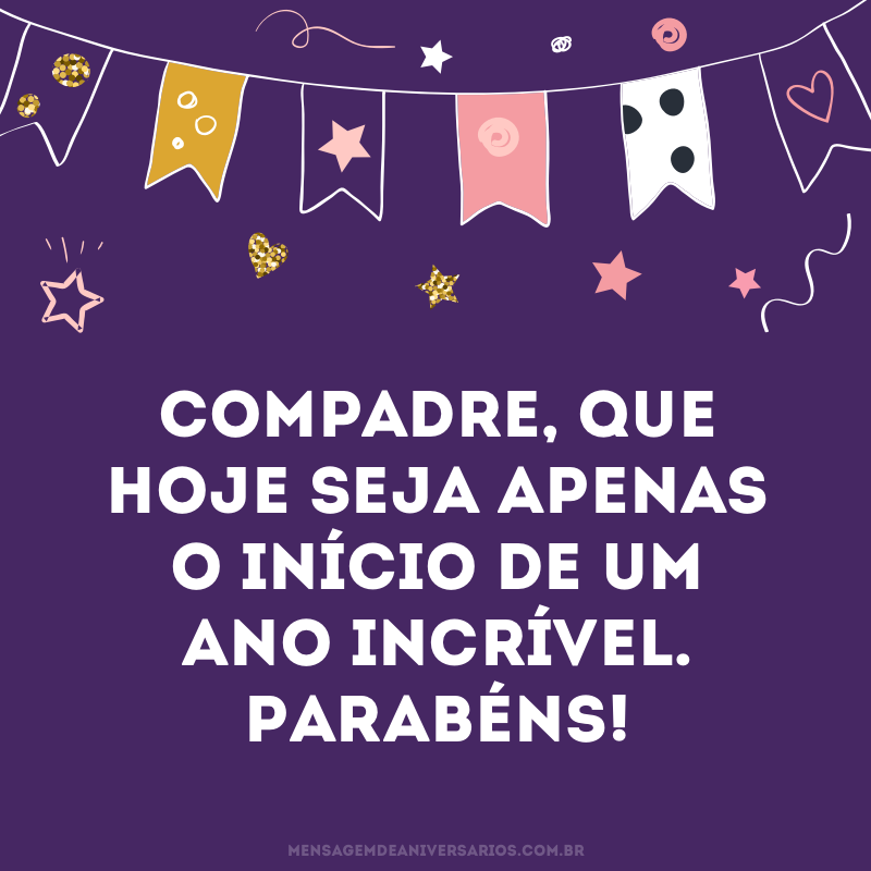 Desejo que você tenha muitos sonhos para realizar, metas para alcançar e pessoas queridas para amar. Parabéns, compadre!